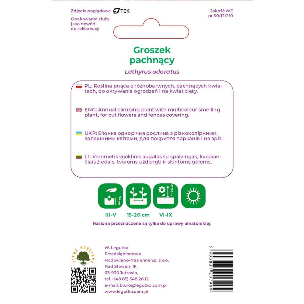 Roślina jednoroczna pnąca wys. 100-150 cm o różnobarwnych pachnących kwiatach. Wysiew w marcu - kwietniu do gruntu po kilka nasion w odstępach 15-20 cm w rzędzie. Wymaga gleby żyznej, głęboko uprawionej, zasobnej w wapń. Stanowisko słoneczne. Kwitnie: czerwiec - wrzesień. Zastosowanie: do okrywania ogrodzeń, balkonów, werand, na kwiat cięty.