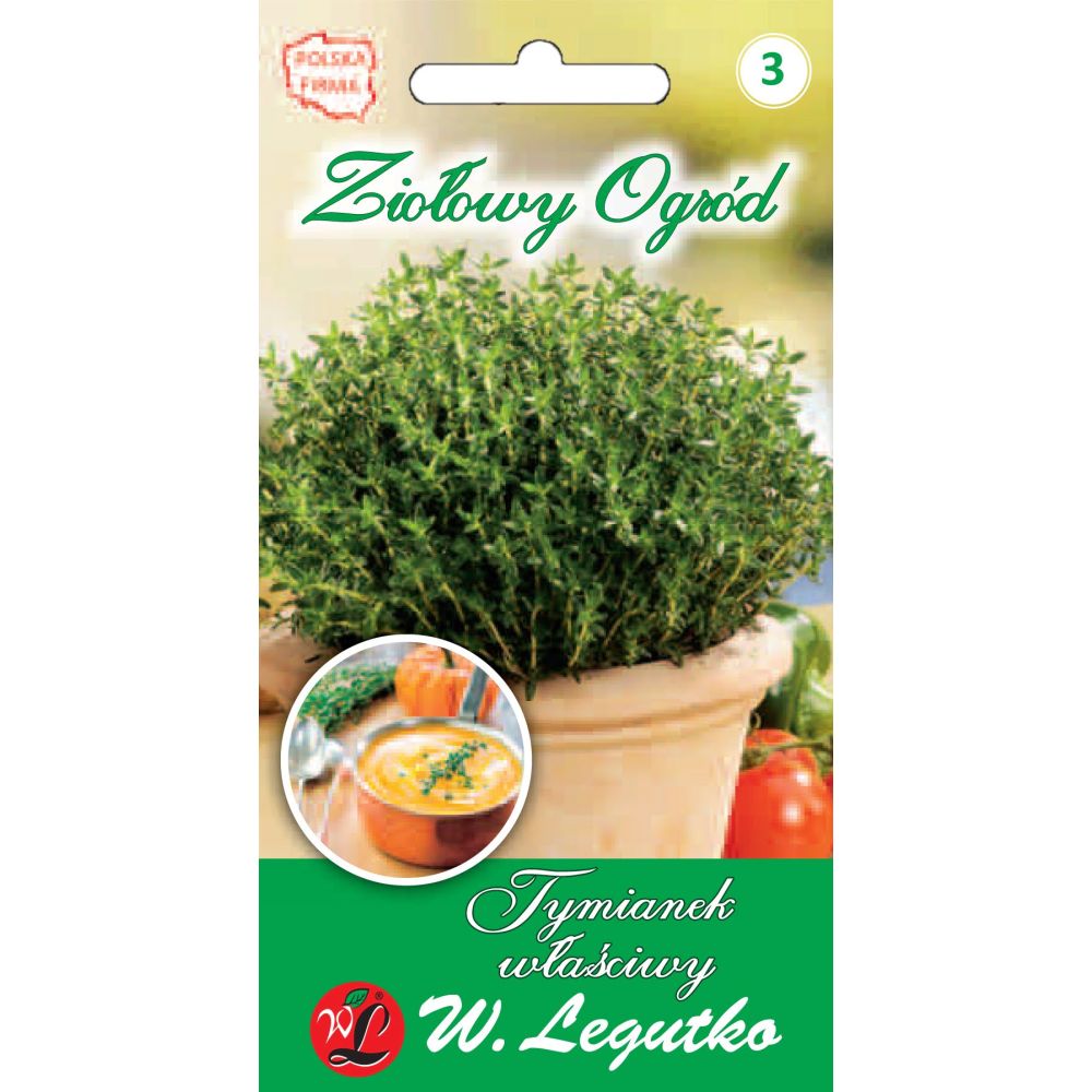 Roślina wieloletnia wysokości ok. 40 cm. Stosowana jako przyprawa go gęstych zup, dziczyzny, tłustych mięs, serów, ziemniaków oraz wędlin. Leczniczo działa moczopędnie, wykrztuśnie, łagodzi skurcze żołądka, nerwobóle, wspomaga trawienie. Napar lub olejek tymiankowy stosuje się zewnętrznie w chorobach skóry. Siew w kwietniu, maju wprost do gruntu w rzędy co 25 cm. W temp. 20-25 stopniach Celsjusza wschody następują w ciągu 7-14 dni. Rośliny ścina się na początku kwietnia w drugim roku i suszy w przewiewnym, zacienionych miejscu.