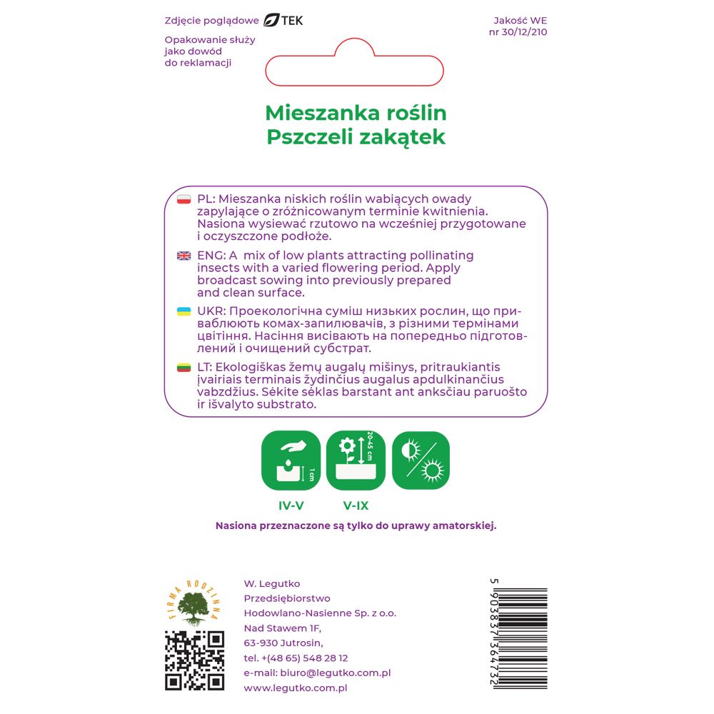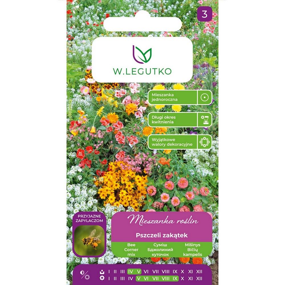 Jeśli chcesz stworzyć kolorowy, proekologiczny zakątek z niskich roślin wabiących owady zapylające to ta mieszanka będzie idealna. Specjalnie dobrane gatunki roślin dorastających od 15 do 45 cm zagwarantują piękną i ciekawą rabatę. Dzięki zróżnicowanym terminom kwitnienia mieszanka zapewnia owadom dostęp do pokarmu przez dług czas. Nasiona wysiewać rzutowo od kwietnia do maja na wcześniej przygotowane podłoże (przekopane, oczyszczone z korzeni, resztek innych roślin i kamieni). Podlewać przez 4-6 tyg. po wysiewie oraz regularnie odchwaszczać.