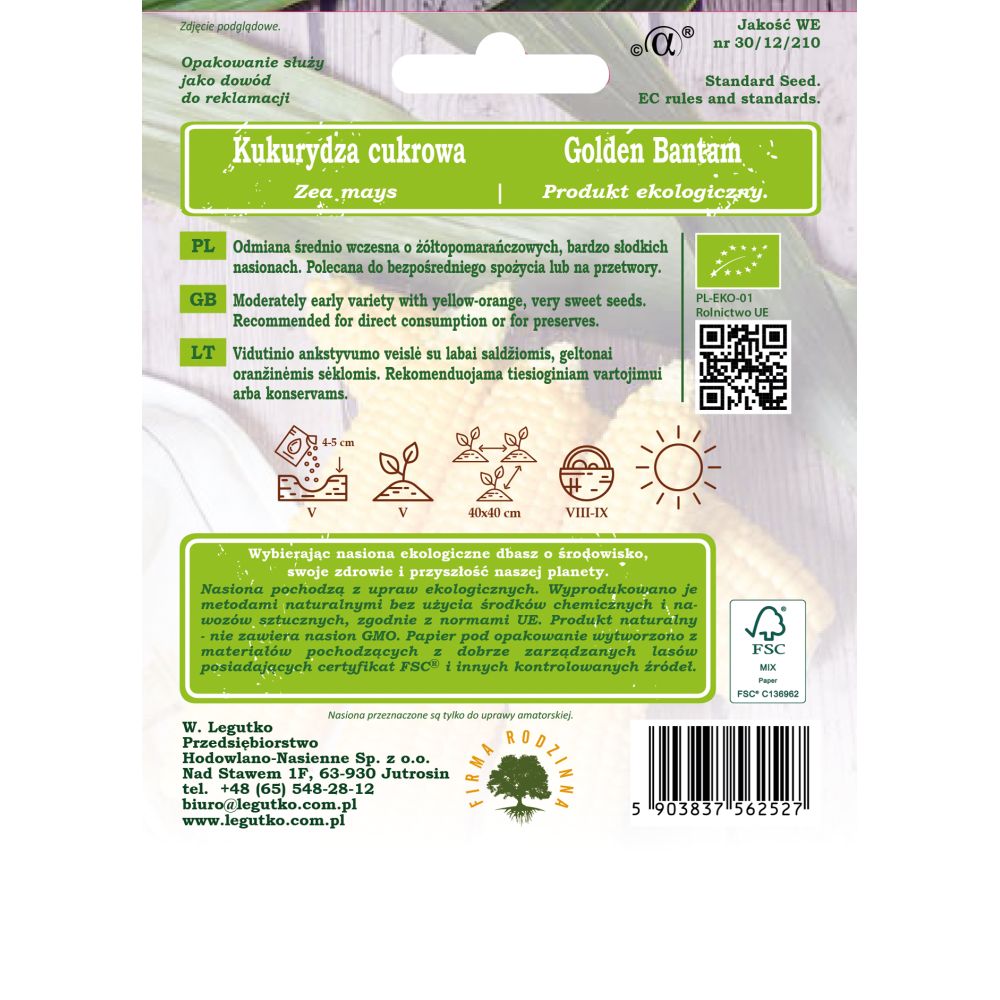 Nasiona pochodzą z upraw ekologicznych. Wyprodukowano je metodami naturalnymi bez użycia środków chemicznych i nawozów sztucznych, zgodnie z normami UE. Produkt naturalny - nie zawiera nasion GMO. Papier pod opakowanie wytworzono z materiałów pochodzących z dobrze zarządzanych lasów posiadających certyfikat FSC i innych kontrolowanych źródeł.