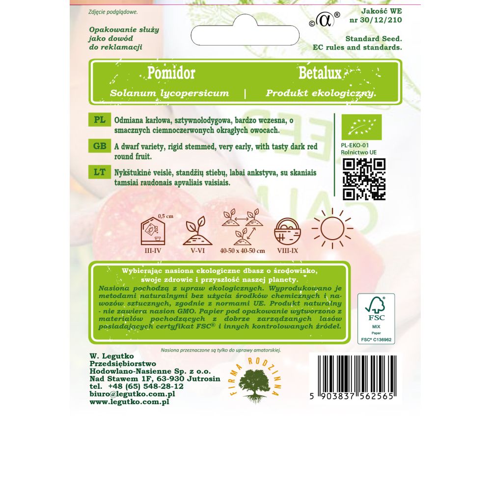 Pomidor gruntowy karłowy sztywnołodygowy Betalux BIO - Solanum lycopersicum - czerwony - opakowanie zawiera 0,2g nasion