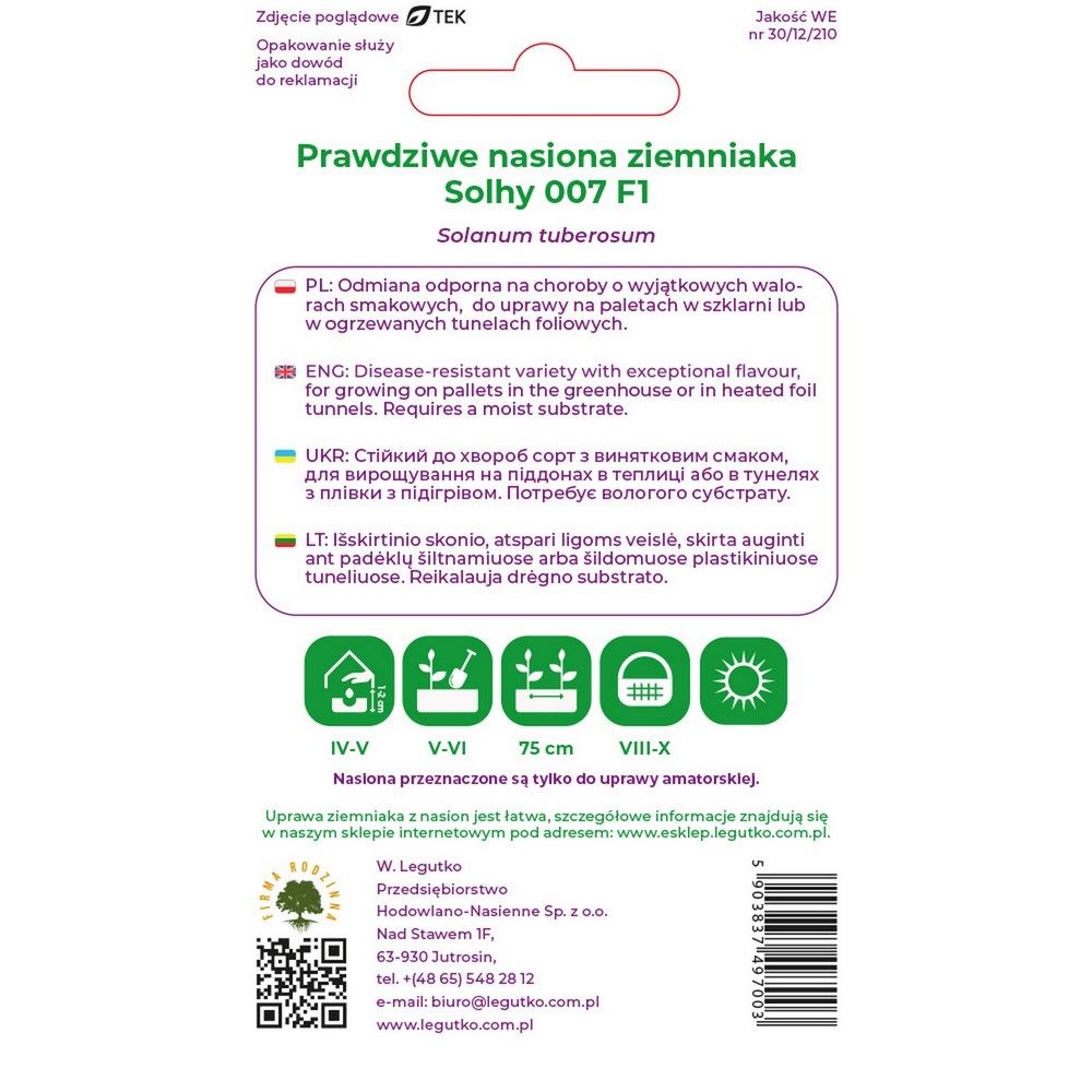 Nasiona należy wysiewać od końca kwietnia do połowy maja - do palet wysiewnych znajdujących się w szklarni lub w ogrzewanych tunelach foliowych, umieszczając po 1 nasionie na środku każdej komory paletki. Do przygotowania rozsad zaleca się - używać ziemi lub substratu torfowego. Konieczne jest utrzymywanie stałej wilgotności podłoża, aby nie doprowadzić do jego wyschnięcia. Optymalna temperatura kiełkowania wynosi 16-22 st. C. Po ok. 4-5 tygodniach uzyska się odpowiednio rozwinięte sadzonki nadające się do wysadzenia do gruntu. Siewki ziemniaka uprawia - się w radlinie (niewysokim wale ziemi), w rozstawie 75cm szerokości. Ważne jest żeby sadzonki wysadzać dopiero po przy mrozkach oraz umieszczać je głęboko w ziemi (70-80% rośliny powinno być pod ziemią). Po wysadzeniu wszystkich sadzonek należy je podlać, natomiast w czasie wzrostu obsypywać (radlić) rośliny. Po 3-4 miesiącach rozpocznie się okres plonowania.