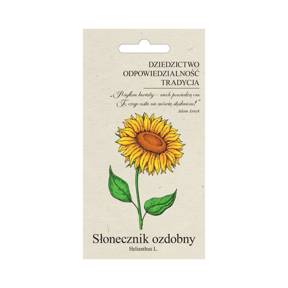 Jednoroczna, popularna roślina ozdobna o dużych, miododajnych, żółtych kwiatach. Słonecznik najlepiej rośnie na glebie żyznej, średnio wilgotnej i dobrze nawiezionej ponieważ potrzebują dużo składników - pokarmowych. (Najlepiej nawozić przez cały sezon wegetacyjny). Preferuje też stanowisko słoneczne, osłonięte od wiatru. Nasiona wysiewa się wprost do gruntu od kwietnia (po przymrozkach) do czerwca. Kwiaty pojawiają się od lipca do września przyciągając pszczoły i inne owady - zapylające. Słoneczniki można siać w grupach lub pojedynczo, idealnie prezentują się w ogrodach wiejskich, naturalistycznych. Nadają się - również do uprawy w pojemnikach i donicach. Ich piękne kwiaty wykorzystać można jako kwiat cięty do wazonu lub kompozycji. (Najlepiej za parzyć jego końcówki we wrzątku, po czym sparzone fragmenty ściąć).
