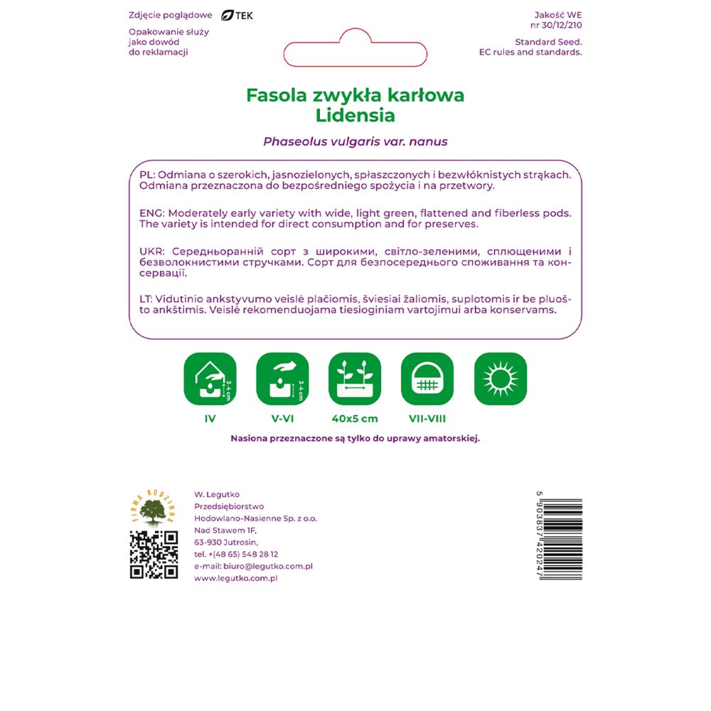 Fasola szparagowa karłowa Lidensia, zielonostrąkowa/Phaseolus vulgaris var. nanus/40g