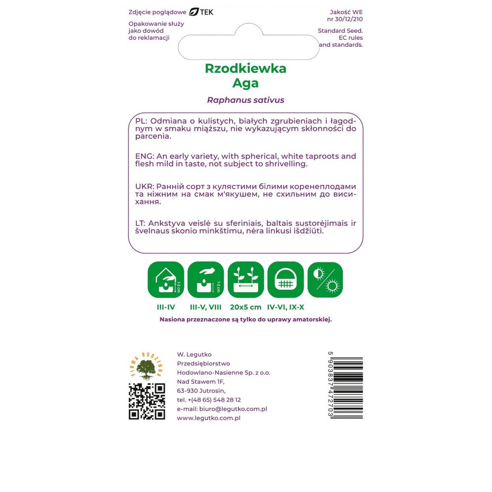 Rzodkiewka Aga to odmiana o kulistych, białych zgrubieniach i łagodnym w smaku miąższu, nie wykazującym skłonności do parcenia.