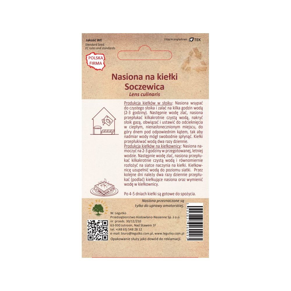 Produkcja kiełków w kiełkownicy - namoczyć na 2-3 godziny w letniej wodzie. Następnie przepłukać kilkakrotnie czystą wodą i równomiernie rozłożyć na siatce naczynia na kiełki. Kiełkownicę uzupełnić wodą. Przez kolejne dni należy do poziomu siatki, dwa razy dziennie przepłukać (podlać) kiełkujące nasiona oraz wymieniać wodę w kiełkownicy. Po 4-5 dniach kiełki są gotowe do spożycia.