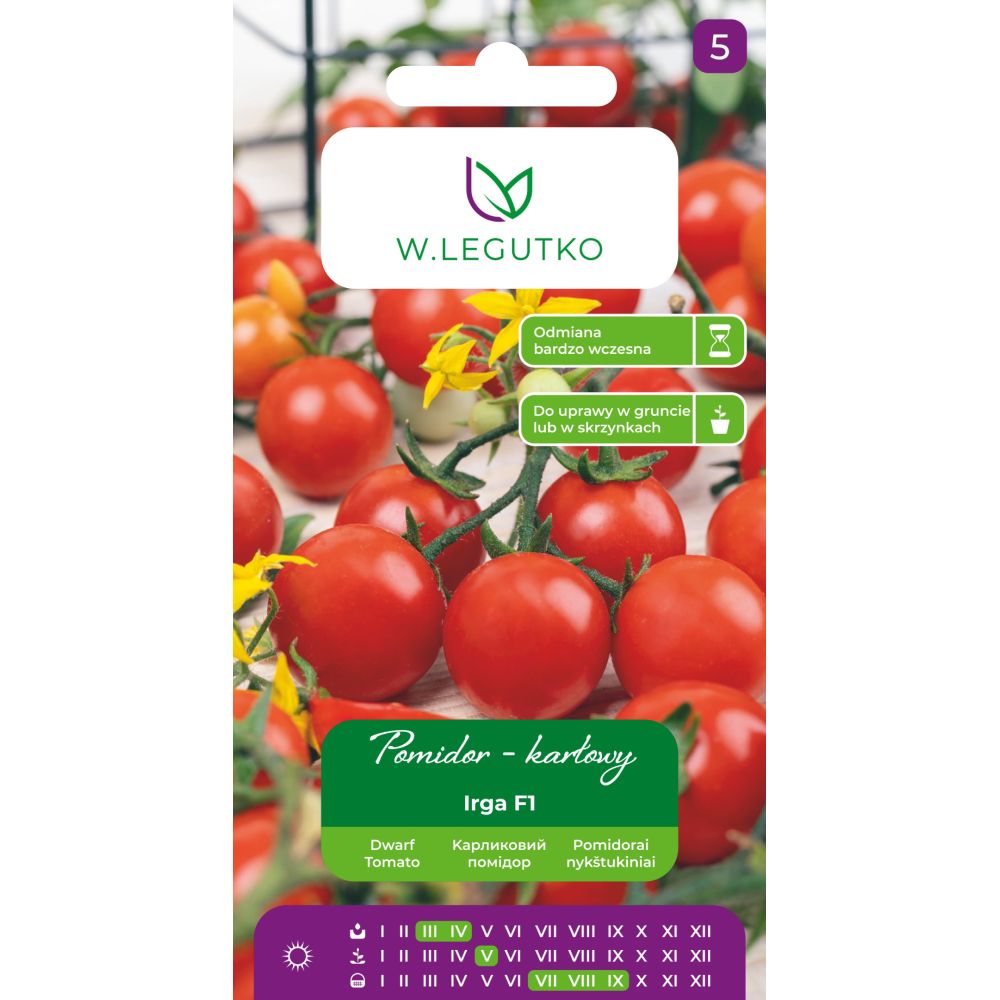 Pomidor Irga F1 (Solanum lycopersicum) to bardzo wczesna odmiana pomidora gruntowego karłowego, wiotkołodygowa. Jest to pomidor koktajlowy typu cherry, który wyróżnia się intensywnie czerwonymi, soczystymi owocami o słodkim smaku. Dzięki swojej niskiej i zwartej budowie, idealnie nadaje się do uprawy zarówno w ogrodzie, jak i w pojemnikach na balkonach czy tarasach.