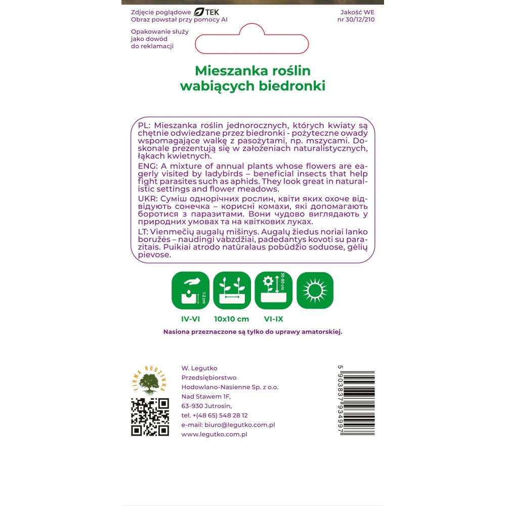 Mieszanka roślin jednorocznych, których kwiaty są chętnie odwiedzane przez biedronki - pożyteczne owady wspomagające walkę z pasożytami, np. mszycami. Doskonale prezentują się w założeniach naturalistycznych, łąkach kwietnych.