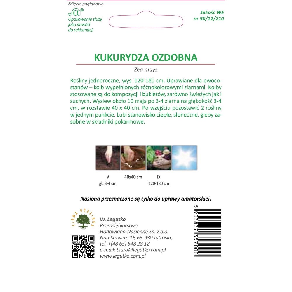 Rośliny jednoroczne wys. 120-180 cm. Uprawiane dla owocostanów - kolb wypełnionych różnokolorowymi ziarnami. Kolby stosowane są do kompozycji i bukietów zarówno świeżych jak i suchych. Wysiew około 10 maja po 3-4 ziarna na głębokość 3-4 cm, w rozstawie 40 x 40 cm. Po wzejściu przerwać pozostawiając jedną, maksymalnie dwie rośliny w jednym punkcie. Lubi stanowisko ciepłe, słoneczne, gleby zasobne w składniki pokarmowe.