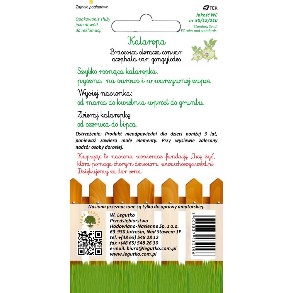Kalarepka szybko rosnąca , pyszna na surowo i w warzywnej zupce. Wysiewaj nasionka: od marca do kwietnia wprost do gruntu. Zbieraj kalarepkę od czerwca do lipca. Siejąc nasiona, twoje dziecko poprzez zabawę uczy się podstaw ogrodnictwa oraz ekologii.
