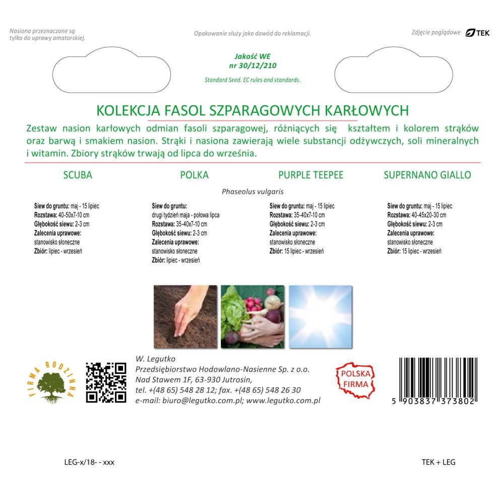 Zestaw nasion karłowych odmian fasoli szparagowej, różniących się kształtem i kolorem strąków oraz barwą i smakiem nasion. Strąki i nasiona zawierają wiele substancji odżywczych, soli mineralnych i witamin. Zbiory strąków trwają od lipca do września.