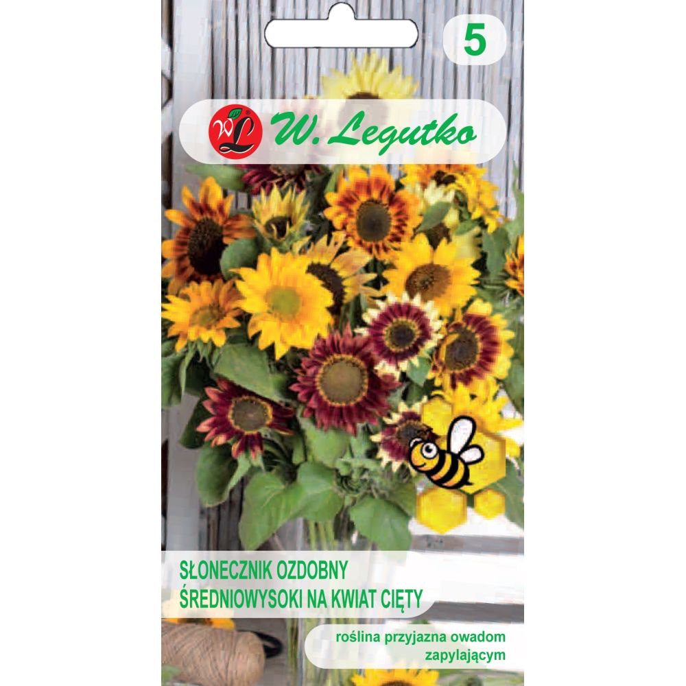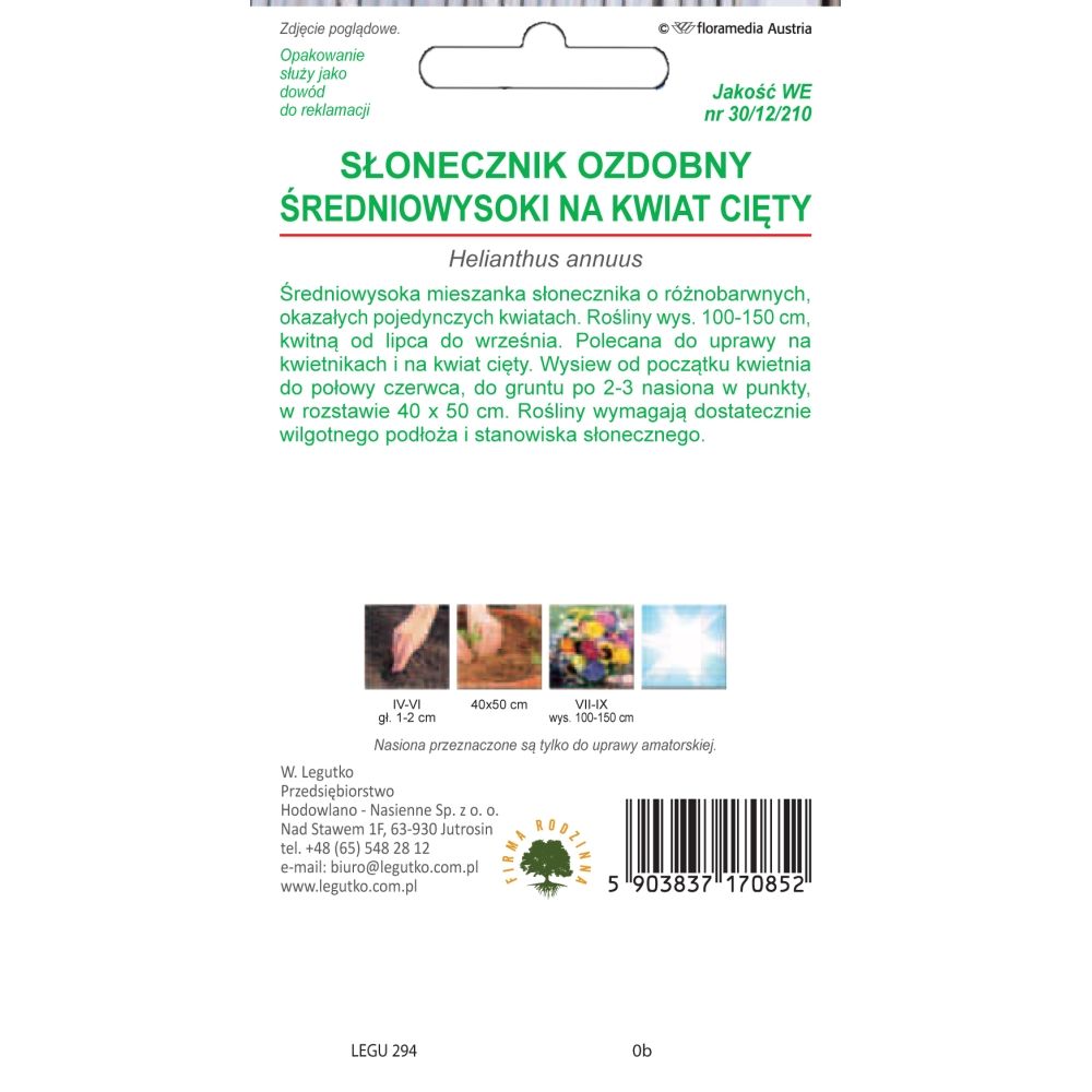 Średniowysoka mieszanka słonecznika o różnobarwnych, okazałych pojedynczych kwiatach. Rośliny wys. 100‐150 cm, kwitną od lipca do września. Polecana do uprawy na kwietnikach i na kwiat cięty. Wysiew od kwietnia do czerwca, do gruntu po 2‐3 nasiona w punkty, w rozstawie 40x50 cm. Rośliny wymagają dostatecznie wilgotnego podłoża i stanowiska słonecznego.