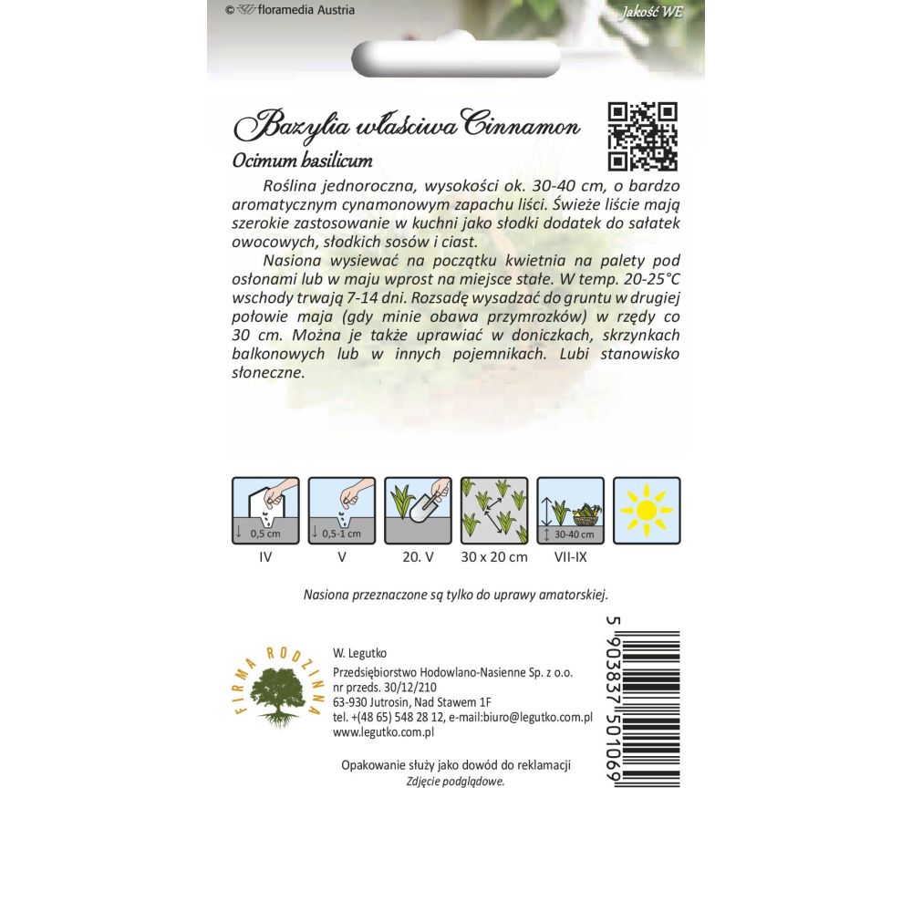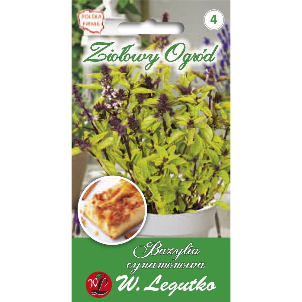 Roślina jednoroczna, wysokości ok.30-40 cm, o bardzo aromatycznym cynamonowym zapachu liści. Świeże liście mają szerokie zastosowanie w kuchni jako dodatek do zapiekanek, serów, ryb i sosów. Napar z bazylia korzystnie wpływa na układ trawienny. Nasiona wysiewać na początku kwietnia na palety pod osłonami lub w maju wprost na miejsce stałe. W temp.20-25oC wschody trwają 7-14 dni. Rozsadę wysadzać do gruntu w drugiej połowie maja (gdy minie obawa przymrozków) w rzędy co 30 cm. Można je także uprawiać w doniczkach, skrzynkach balkonowych lub w innych pojemnikach. Lubi stanowisko słoneczne.