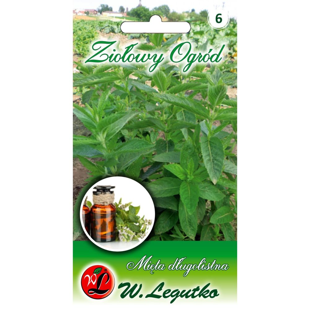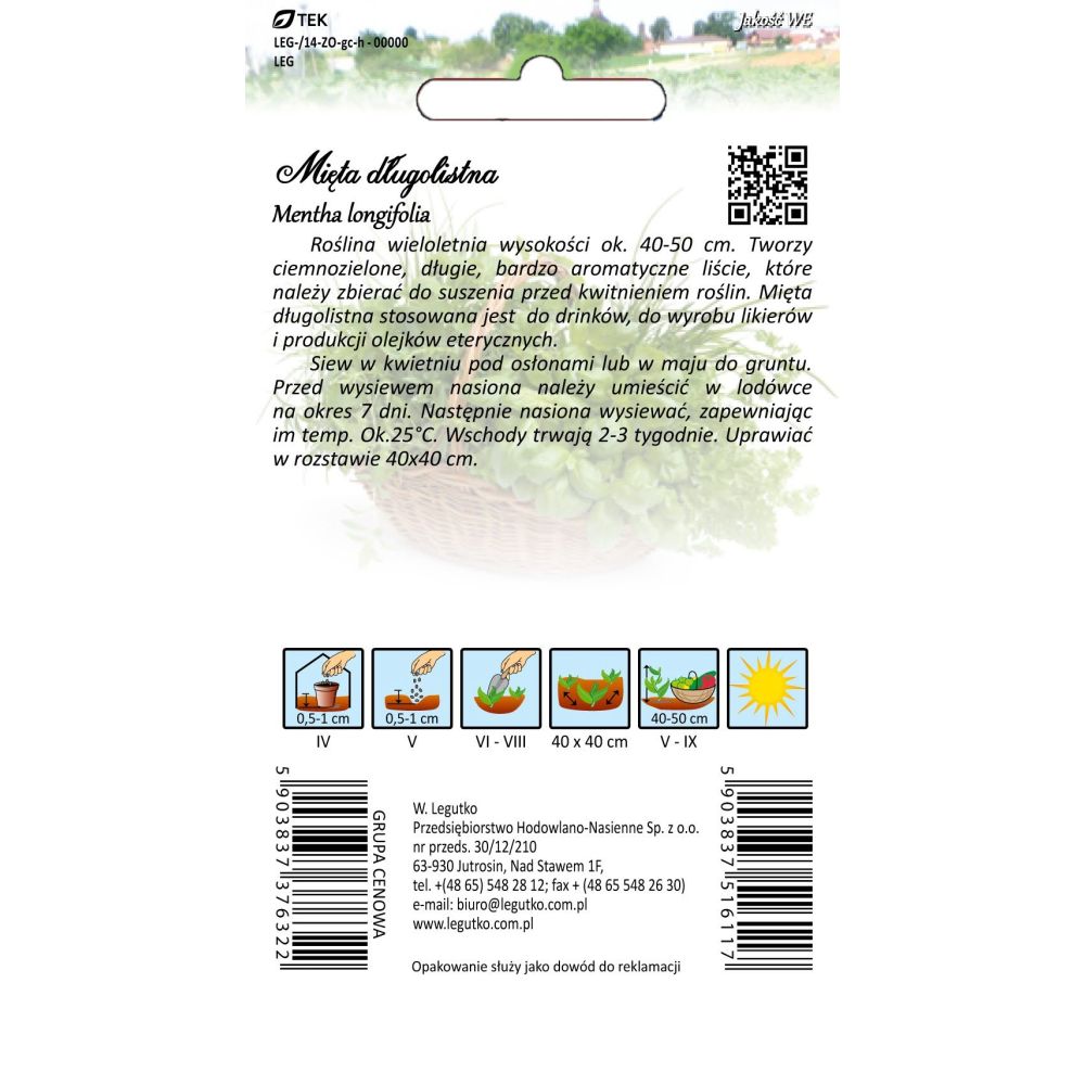 Roślina wieloletnia wysokości ok. 40-50 cm. Tworzy ciemnozielone, długie, bardzo aromatyczne liście, które należy zbierać do suszenia przed kwitnieniem roślin. Mięta długolistna stosowana jest do drinków, do wyrobu likierów i produkcji olejków aromatycznych. Siew w kwietniu pod osłonami lub w maju do gruntu. Przed wysiewem nasiona należy umieścić w lodówce na okres 7 dni. Następnie nasiona wysiewać, zapewniając im temp. ok. 25 stopni C. Wschody trwają 2-3 tygodnie. Uprawiać w rozstawie 40x40 cm.